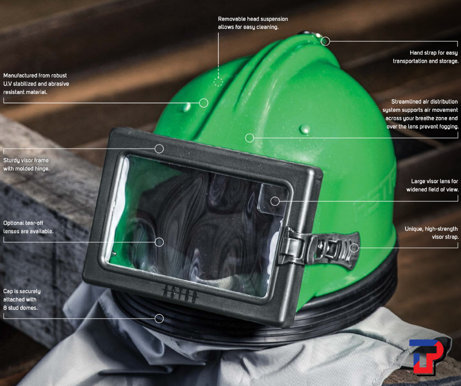 - ท่อช่วยหายใจที่ยืดหยุ่นช่วยให้เคลื่อนไหวศีรษะได้สะดวกขณะพ่นทราย