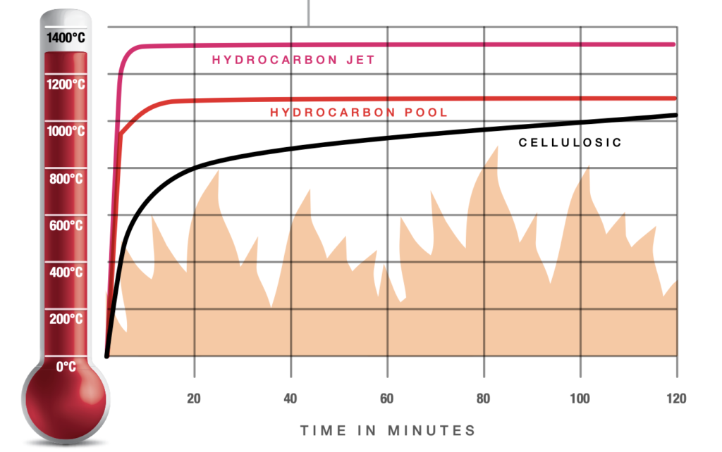 โดย Hydrocarbon Jet Fire จะมีอัตราการเพิ่มของอุณหภูมิรวดเร็วกว่า Hydrocarbon Pool Fire และ Cellolosic fire ตามลำดับ ดังนั้นการออกแบบระบบการป้องกันไฟ Fire Protection จึงต้องคำนึงถึงลักษณะของไฟแต่ละชนิดที่อาจเกิดขึ้น ณ บริเวณนั้น ๆ จึงจะเหมาะสมที่สุด
