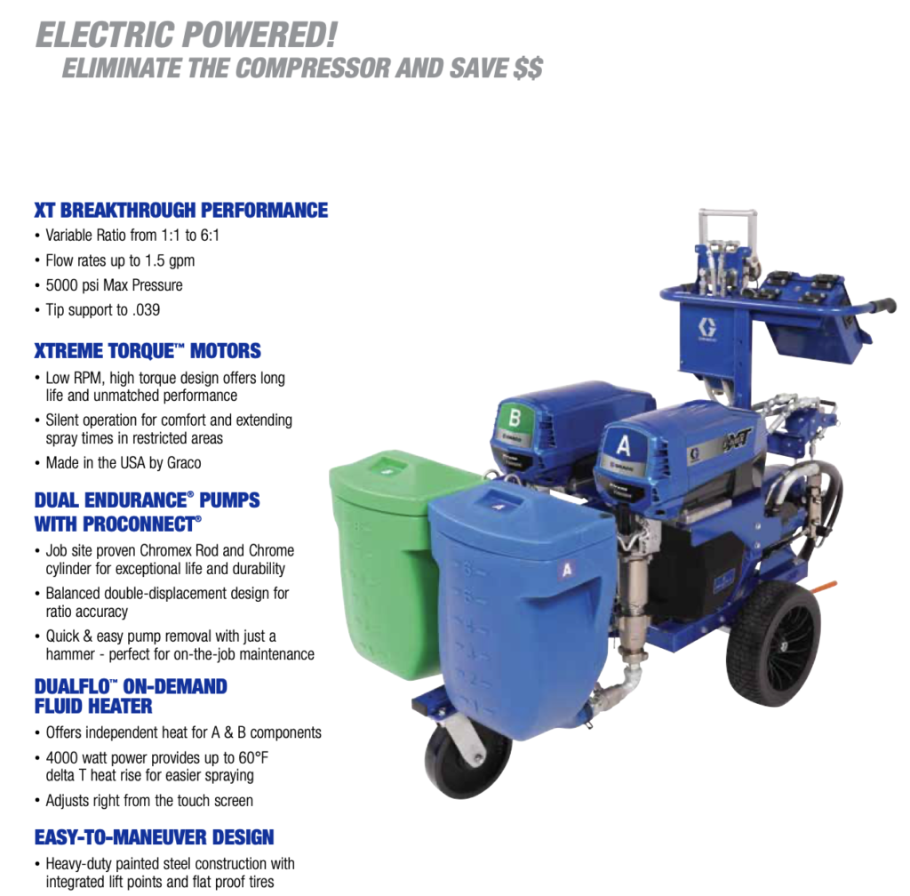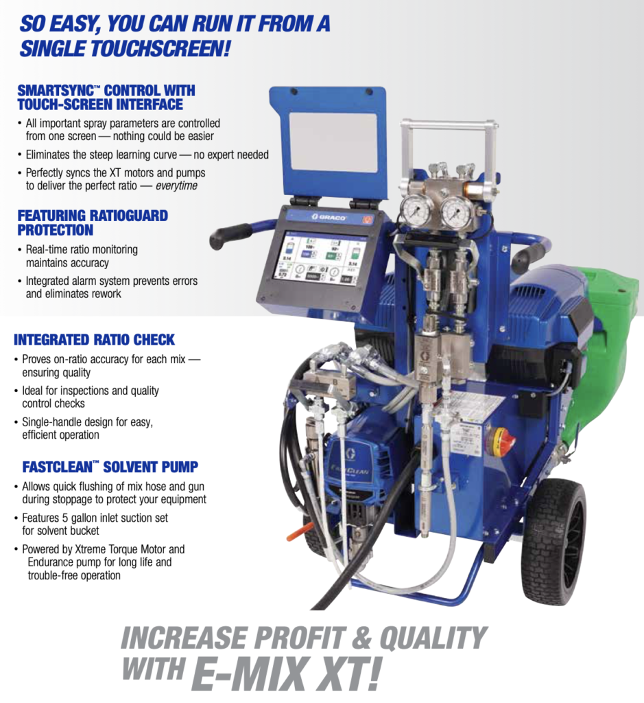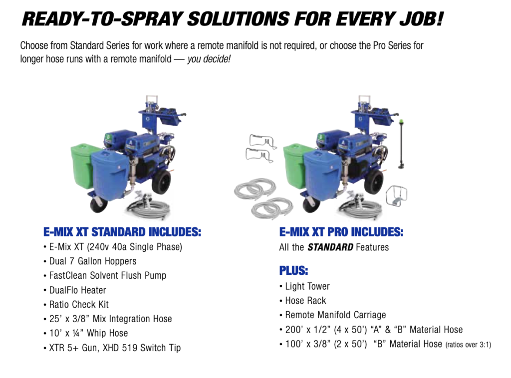 The E-Mix XT is the most economical, easy-to-operate & portable electric variable ratio spray system to date! Designed to handle spray ratios from 1:1 up to 6:1, it is also fully capable with coatings up to 100% solids content — making it an ideal solution for nearly every job!