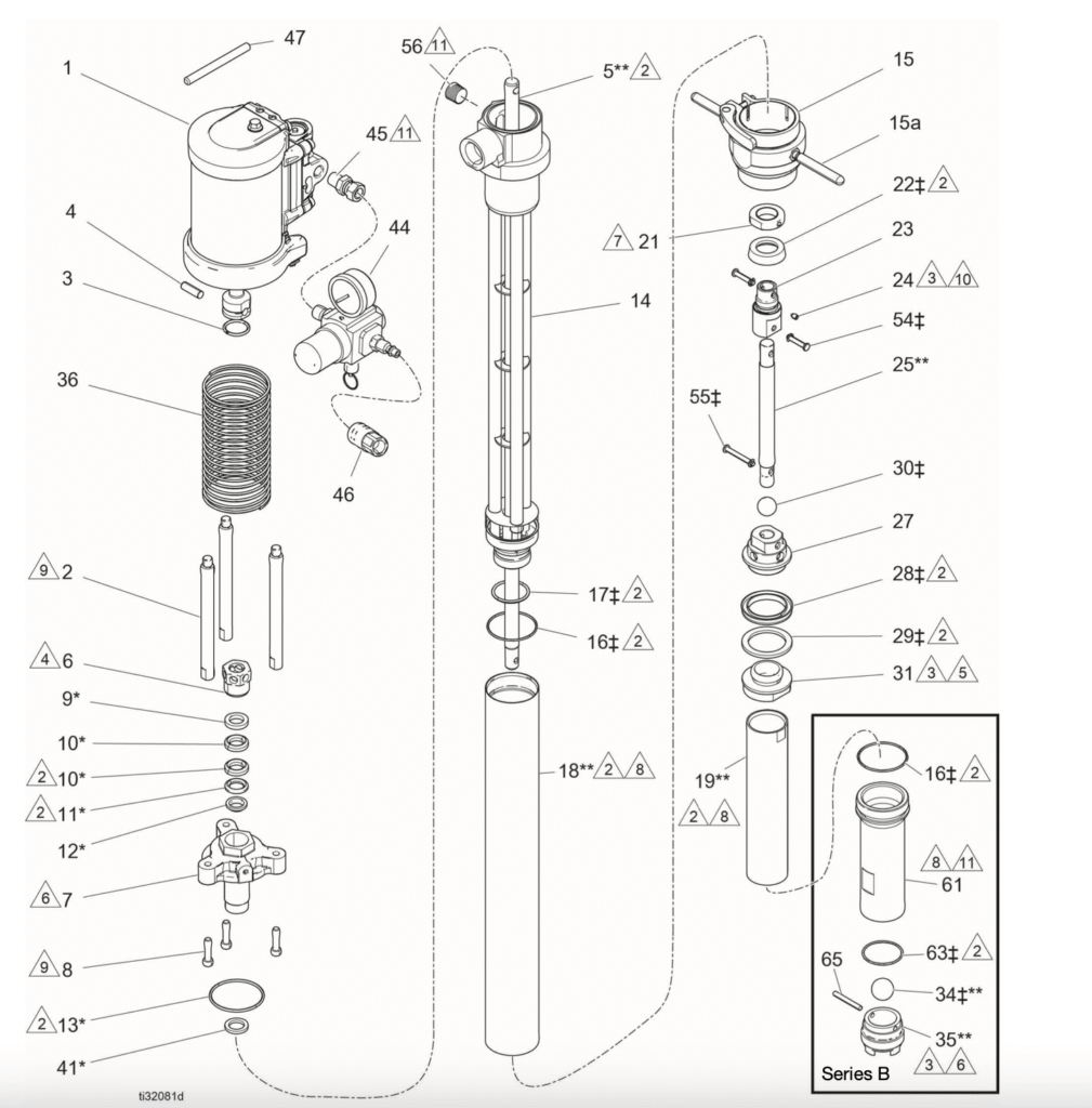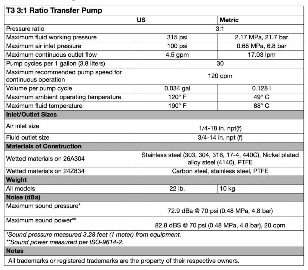 ปั๊มลำเลียงสาร Graco T3 ใช้มอเตอร์ลม Merkur ที่ขึ้นชื่อของ Graco และช่วงล่างสแตนเลสหรือเหล็กคาร์บอนลักษณะเหมือนแบบ T2
